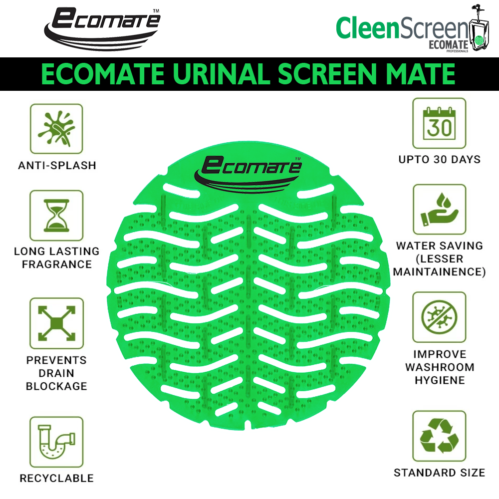 Upgrade your restroom hygiene effortlessly with Ecomate Premium Urinal Screens Deodorizer – Cucumber Melon Fragrance. A fresh and clean restroom experience starts here!